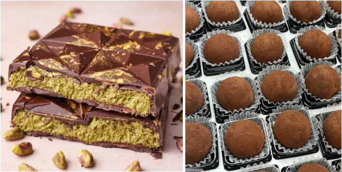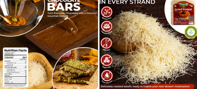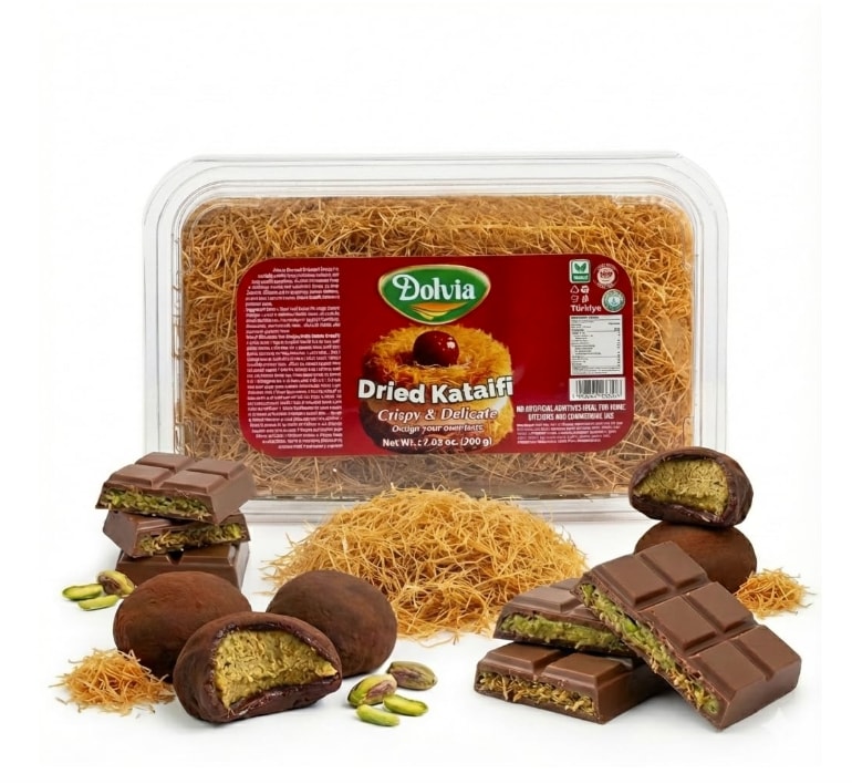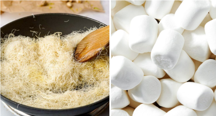 카다이프 (Kataifi) 150~200g/ 무염버터 50g / 피스타치오 스프레드 200g / 마시멜로우 150~200g / 다크 또는 밀크 초콜릿 200g / 코코아 가루