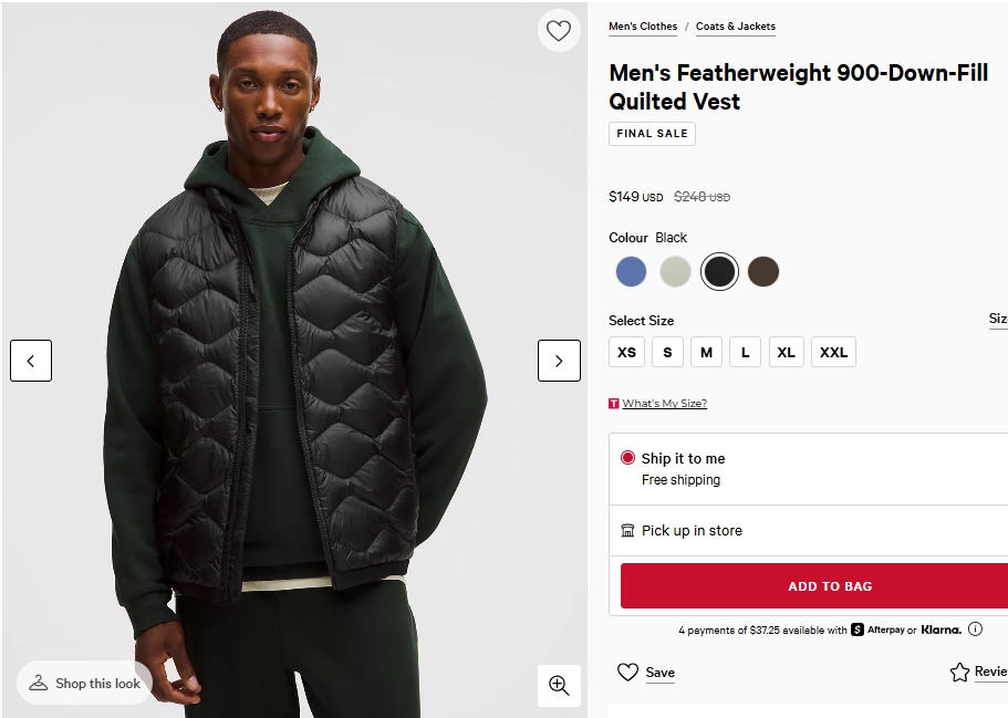 페더웨이트 900다운필 퀼팅베스트 $149.00